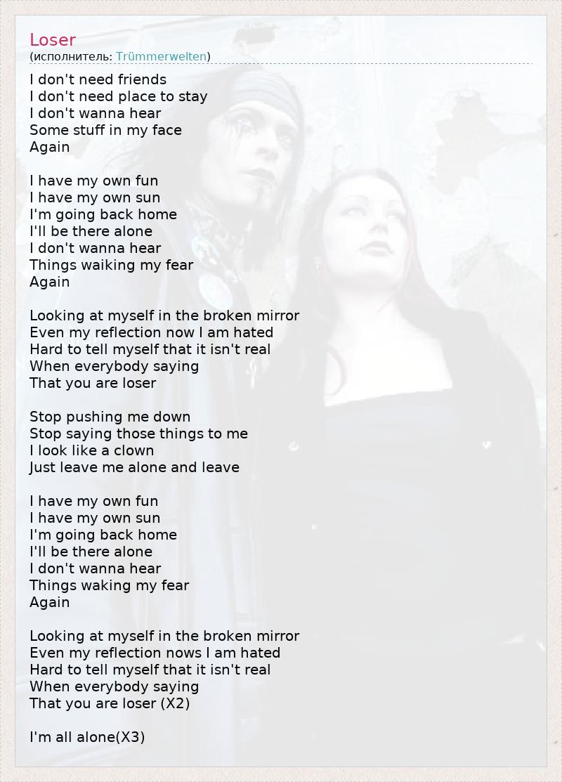 I don't need friends I don't need place to stay I don't wanna hear Some stuff in my face Again I have my own fun I have my own sun I'm going back home I'll be there alone I don't wanna hear Things waiking my fear Again Looking at myself in the broken mirror Even my reflection now I am hated Hard to tell myself that it isn't real When everybody saying That you are loser Stop pushing me down Stop saying those things to me I look like a clown Just leave me alone and leave I have my own fun I have my own sun I'm going back home I'll be there alone I don't wanna hear Things waking my fear Again Looking at myself in the broken mirror Even my reflection nows I am hated Hard to tell myself that it isn't real When everybody saying That you are loser (X2) I'm all alone(X3)