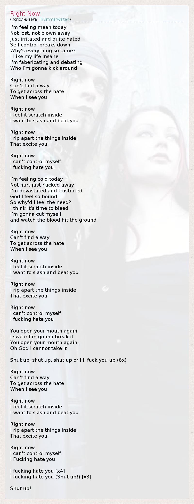 Что-то мне сегодня не по себе, Нет – это вовсе не отрешенность или ступор, Лишь раздраженность и тихая ярость. Самоконтролю пришел конец. Почему все так просто?! Я так люблю безумие в своей жизни Сейчас подумаем и решим, Кого сегодня побить. Прямо сейчас Не могу найти способа Погасить в себе злость, Когда вижу тебя. Прямо сейчас Прям кошки скребут, Мне охота кромсать и резать тебя. Прямо сейчас Я уничтожил все в себе, Что тебя привлекало. Прямо сейчас Я не могу удержаться, Я тебя, блин, ненавижу! Что-то мне сегодня холодно, Меня не ранили, а просто отымели. Я опустошен и разочарован, Боже, я полон решимости! Почему я чувствую это желание? Кажется, сейчас время пустить кровь, Сейчас порежусь И кровь прольется на землю. Прямо сейчас Не могу найти способа Погасить в себе злость, Когда вижу тебя. Прямо сейчас Прям кошки скребут, Мне охота кромсать и резать тебя. Прямо сейчас Я уничтожил все в себе, Что тебя привлекало. Прямо сейчас Я не могу удержаться, Я тебя, блин, ненавижу! Ты снова пасть открыл, Клянусь, я больше не допущу этого. Ты снова пасть открыл, Мой Бог, не могу стерпеть этого. Заткнись, заткнись, заткнись или я тебя у**у...(x6) Прямо сейчас Не могу найти способа Погасить в себе злость, Когда вижу тебя. Прямо сейчас Прям кошки скребут, Мне охота кромсать и резать тебя. Прямо сейчас Я уничтожил все в себе, Что тебя привлекало. Прямо сейчас Я не могу удержаться, Я тебя, блин, ненавижу! Я тебя, блин, ненавижу! (x4) Я тебя, блин, ненавижу! Заткнись! (х3) Заткнись!!!