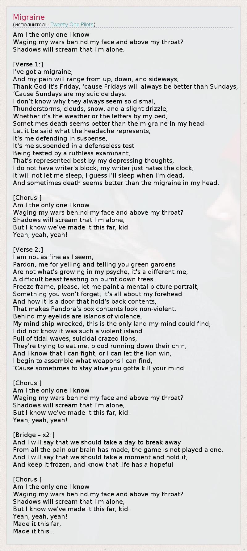 Это интересно:Дуэт из Коламбуса Twenty One Pilots играет довольно смелую и экспериментальную смесь инди и хип-хоп музыки, не забывая при этом использовать разнообразные электронные сэмплы. При создании своего саунда участники группы используют фортепиано, синтезаторы, барабаны, а иногда и укулеле, что ставит многих в тупик, при попытке отнести Twenty One Pilots к какому то определенному музыкальному жанру. Сами... продолжение
