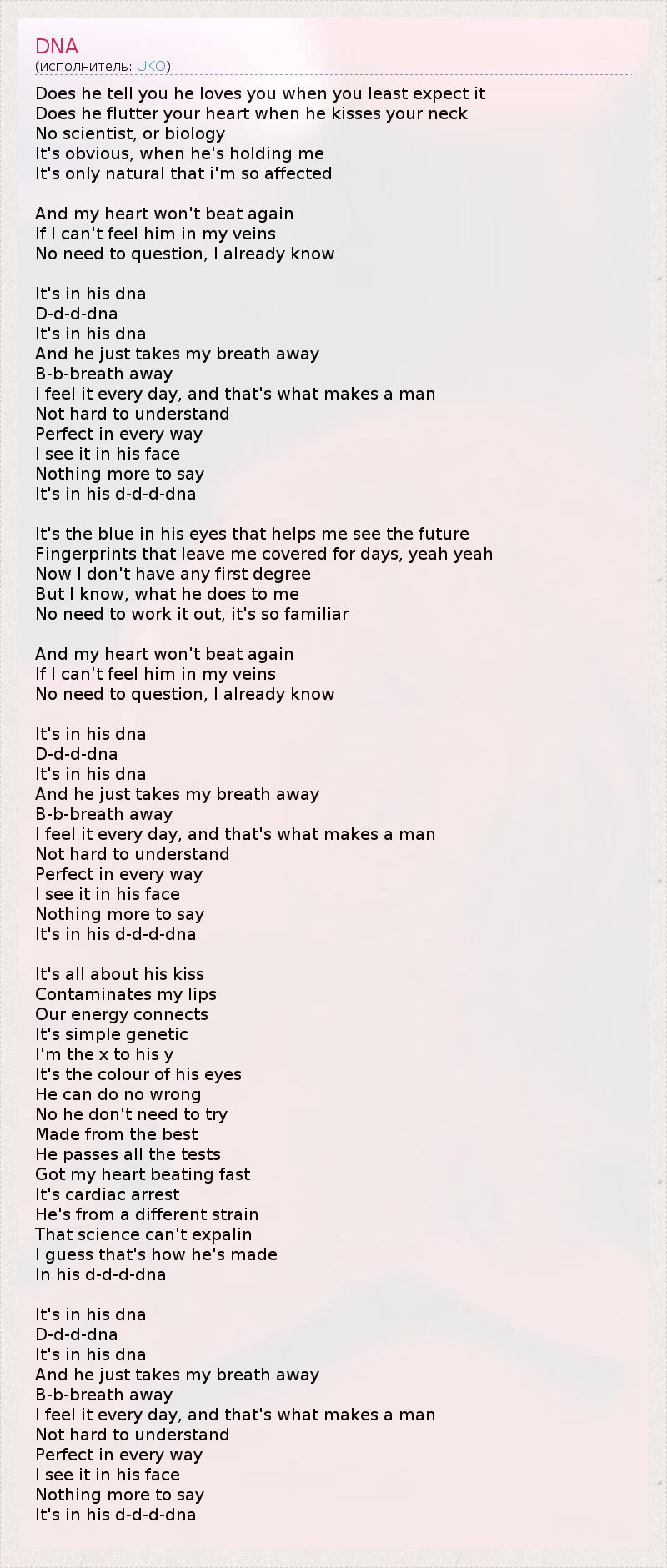 Does he tell you he loves you when you least expect it Does he flutter your heart when he kisses your neck No scientist, or biology It's obvious, when he's holding me It's only natural that i'm so affected And my heart won't beat again If I can't feel him in my veins No need to question, I already know It's in his dna D-d-d-dna It's in his dna And he just takes my breath away B-b-breath away I feel it every day, and that's what makes a man Not hard to understand Perfect in every way I see it in his face Nothing more to say It's in his d-d-d-dna It's the blue in his eyes that helps me see the future Fingerprints that leave me covered for days, yeah yeah Now I don't have any first degree But I know, what he does to me No need to work it out, it's so familiar And my heart won't beat again If I can't feel him in my veins No need to question, I already know It's in his dna D-d-d-dna It's in his dna And he just takes my breath away B-b-breath away I feel it every day, and that's what makes a man Not hard to understand Perfect in every way I see it in his face Nothing more to say It's in his d-d-d-dna It's all about his kiss Contaminates my lips Our energy connects It's simple genetic I'm the x to his y It's the colour of his eyes He can do no wrong No he don't need to try Made from the best He passes all the tests Got my heart beating fast It's cardiac arrest He's from a different strain That science can't expalin I guess that's how he's made In his d-d-d-dna It's in his dna D-d-d-dna It's in his dna And he just takes my breath away B-b-breath away I feel it every day, and that's what makes a man Not hard to understand Perfect in every way I see it in his face Nothing more to say It's in his d-d-d-dna