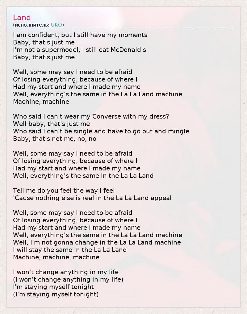 I am confident, but I still have my moments Baby, that's just me I'm not a supermodel, I still eat McDonald's Baby, that's just me Well, some may say I need to be afraid Of losing everything, because of where I Had my start and where I made my name Well, everything's the same in the La La Land machine Machine, machine Who said I can't wear my Converse with my dress? Well baby, that's just me Who said I can't be single and have to go out and mingle Baby, that's not me, no, no Well, some may say I need to be afraid Of losing everything, because of where I Had my start and where I made my name Well, everything's the same in the La La Land Tell me do you feel the way I feel 'Cause nothing else is real in the La La Land appeal Well, some may say I need to be afraid Of losing everything, because of where I Had my start and where I made my name Well, everything's the same in the La La Land machine Well, I'm not gonna change in the La La Land machine I will stay the same in the La La Land Machine, machine, machine I won't change anything in my life (I won't change anything in my life) I'm staying myself tonight (I'm staying myself tonight)