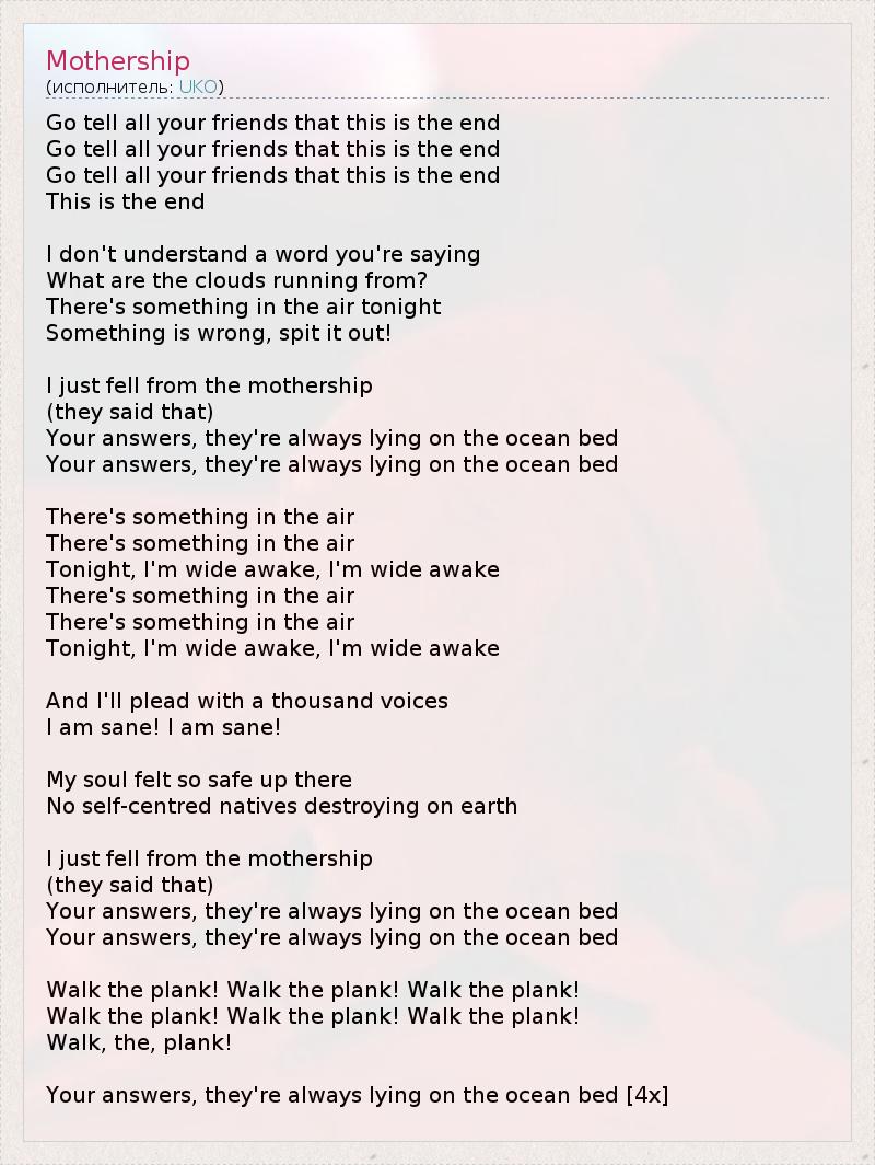 Go tell all your friends that this is the end Go tell all your friends that this is the end Go tell all your friends that this is the end This is the end I don't understand a word you're saying What are the clouds running from? There's something in the air tonight Something is wrong, spit it out! I just fell from the mothership (they said that) Your answers, they're always lying on the ocean bed Your answers, they're always lying on the ocean bed There's something in the air There's something in the air Tonight, I'm wide awake, I'm wide awake There's something in the air There's something in the air Tonight, I'm wide awake, I'm wide awake And I'll plead with a thousand voices I am sane! I am sane! My soul felt so safe up there No self-centred natives destroying on earth I just fell from the mothership (they said that) Your answers, they're always lying on the ocean bed Your answers, they're always lying on the ocean bed Walk the plank! Walk the plank! Walk the plank! Walk the plank! Walk the plank! Walk the plank! Walk, the, plank! Your answers, they're always lying on the ocean bed [4x]