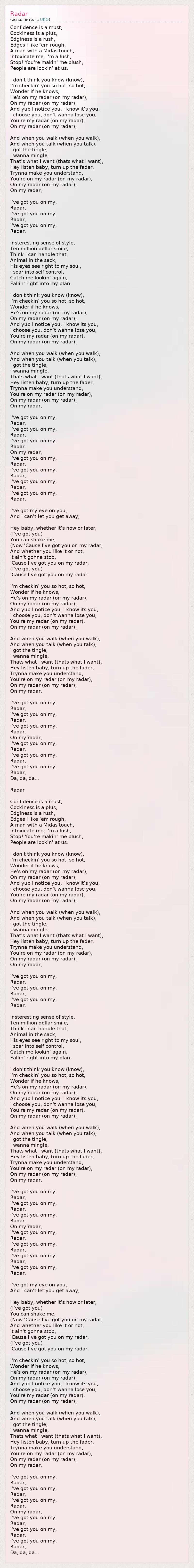 Confidence is a must, Cockiness is a plus, Edginess is a rush, Edges I like 'em rough, A man with a Midas touch, Intoxicate me, I'm a lush, Stop! You're makin' me blush, People are lookin' at us. I don't think you know (know), I'm checkin' you so hot, so hot, Wonder if he knows, He's on my radar (on my radar), On my radar (on my radar), And yup I notice you, I know it's you, I choose you, don't wanna lose you, You're my radar (on my radar), On my radar (on my radar), And when you walk (when you walk), And when you talk (when you talk), I got the tingle, I wanna mingle, That's what I want (thats what I want), Hey listen baby, turn up the fader, Trynna make you understand, You're on my radar (on my radar), On my radar (on my radar), On my radar, I've got you on my, Radar, I've got you on my, Radar, I've got you on my, Radar. Insteresting sense of style, Ten million dollar smile, Think I can handle that, Animal in the sack, His eyes see right to my soul, I soar into self control, Catch me lookin' again, Fallin' right into my plan. I don't think you know (know), I'm checkin' you so hot, so hot, Wonder if he knows, He's on my radar (on my radar), On my radar (on my radar), And yup I notice you, I know its you, I choose you, don't wanna lose you, You're my radar (on my radar), On my radar (on my radar), And when you walk (when you walk), And when you talk (when you talk), I got the tingle, I wanna mingle, Thats what I want (thats what I want), Hey listen baby, turn up the fader, Trynna make you understand, You're on my radar (on my radar), On my radar (on my radar), On my radar, I've got you on my, Radar, I've got you on my, Radar, I've got you on my, Radar. On my radar, I've got you on my, Radar, I've got you on my, Radar, I've got you on my, Radar, I've got you on my, Radar. I've got my eye on you, And I can't let you get away, Hey baby, whether it's now or later, (I've got you) You can shake me, (Now 'Cause I've got you on my radar, And whether you like it or not, It ain't gonna stop, 'Cause I've got you on my radar, (I've got you) 'Cause I've got you on my radar. I'm checkin' you so hot, so hot, Wonder if he knows, He's on my radar (on my radar), On my radar (on my radar), And yup I notice you, I know its you, I choose you, don't wanna lose you, You're my radar (on my radar), On my radar (on my radar), And when you walk (when you walk), And when you talk (when you talk), I got the tingle, I wanna mingle, Thats what I want (thats what I want), Hey listen baby, turn up the fader, Trynna make you understand, You're on my radar (on my radar), On my radar (on my radar), On my radar, I've got you on my, Radar, I've got you on my, Radar, I've got you on my, Radar. On my radar, I've got you on my, Radar, I've got you on my, Radar, I've got you on my, Radar, Da, da, da... Radar Confidence is a must, Cockiness is a plus, Edginess is a rush, Edges I like 'em rough, A man with a Midas touch, Intoxicate me, I'm a lush, Stop! You're makin' me blush, People are lookin' at us. I don't think you know (know), I'm checkin' you so hot, so hot, Wonder if he knows, He's on my radar (on my radar), On my radar (on my radar), And yup I notice you, I know it's you, I choose you, don't wanna lose you, You're my radar (on my radar), On my radar (on my radar), And when you walk (when you walk), And when you talk (when you talk), I got the tingle, I wanna mingle, That's what I want (thats what I want), Hey listen baby, turn up the fader, Trynna make you understand, You're on my radar (on my radar), On my radar (on my radar), On my radar, I've got you on my, Radar, I've got you on my, Radar, I've got you on my, Radar. Insteresting sense of style, Ten million dollar smile, Think I can handle that, Animal in the sack, His eyes see right to my soul, I soar into self control, Catch me lookin' again, Fallin' right into my plan. I don't think you know (know), I'm checkin' you so hot, so hot, Wonder if he knows, He's on my radar (on my radar), On my radar (on my radar), And yup I notice you, I know its you, I choose you, don't wanna lose you, You're my radar (on my radar), On my radar (on my radar), And when you walk (when you walk), And when you talk (when you talk), I got the tingle, I wanna mingle, Thats what I want (thats what I want), Hey listen baby, turn up the fader, Trynna make you understand, You're on my radar (on my radar), On my radar (on my radar), On my radar, I've got you on my, Radar, I've got you on my, Radar, I've got you on my, Radar. On my radar, I've got you on my, Radar, I've got you on my, Radar, I've got you on my, Radar, I've got you on my, Radar. I've got my eye on you, And I can't let you get away, Hey baby, whether it's now or later, (I've got you) You can shake me, (Now 'Cause I've got you on my radar, And whether you like it or not, It ain't gonna stop, 'Cause I've got you on my radar, (I've got you) 'Cause I've got you on my radar. I'm checkin' you so hot, so hot, Wonder if he knows, He's on my radar (on my radar), On my radar (on my radar), And yup I notice you, I know its you, I choose you, don't wanna lose you, You're my radar (on my radar), On my radar (on my radar), And when you walk (when you walk), And when you talk (when you talk), I got the tingle, I wanna mingle, Thats what I want (thats what I want), Hey listen baby, turn up the fader, Trynna make you understand, You're on my radar (on my radar), On my radar (on my radar), On my radar, I've got you on my, Radar, I've got you on my, Radar, I've got you on my, Radar. On my radar, I've got you on my, Radar, I've got you on my, Radar, I've got you on my, Radar, Da, da, da...