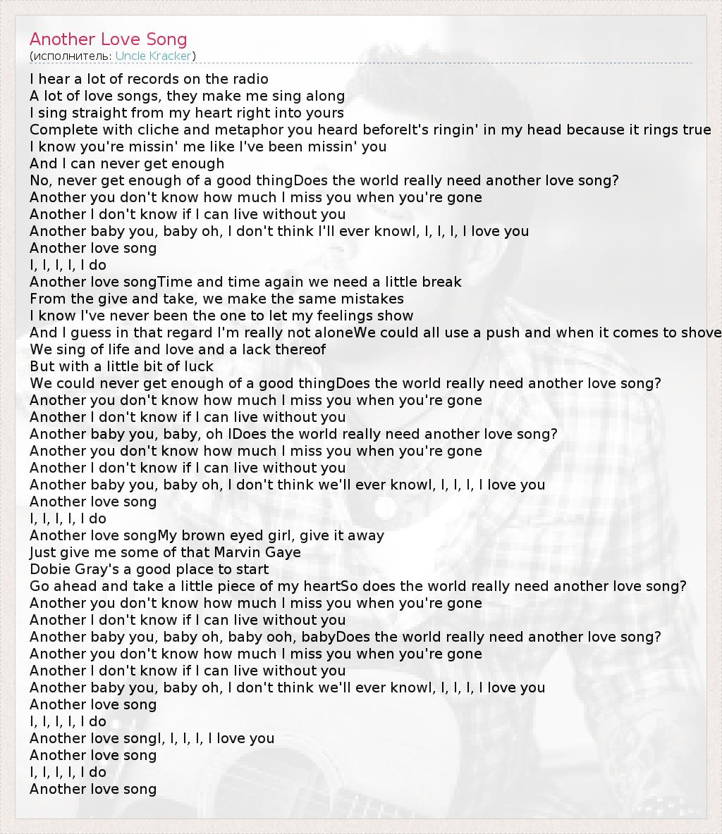 I hear a lot of records on the radio A lot of love songs, they make me sing along I sing straight from my heart right into yours Complete with cliche and metaphor you heard beforeIt's ringin' in my head because it rings true I know you're missin' me like I've been missin' you And I can never get enough No, never get enough of a good thingDoes the world really need another love song? Another you don't know how much I miss you when you're gone Another I don't know if I can live without you Another baby you, baby oh, I don't think I'll ever knowI, I, I, I, I love you Another love song I, I, I, I, I do Another love songTime and time again we need a little break From the give and take, we make the same mistakes I know I've never been the one to let my feelings show And I guess in that regard I'm really not aloneWe could all use a push and when it comes to shove We sing of life and love and a lack thereof But with a little bit of luck We could never get enough of a good thingDoes the world really need another love song? Another you don't know how much I miss you when you're gone Another I don't know if I can live without you Another baby you, baby, oh IDoes the world really need another love song? Another you don't know how much I miss you when you're gone Another I don't know if I can live without you Another baby you, baby oh, I don't think we'll ever knowI, I, I, I, I love you Another love song I, I, I, I, I do Another love songMy brown eyed girl, give it away Just give me some of that Marvin Gaye Dobie Gray's a good place to start Go ahead and take a little piece of my heartSo does the world really need another love song? Another you don't know how much I miss you when you're gone Another I don't know if I can live without you Another baby you, baby oh, baby ooh, babyDoes the world really need another love song? Another you don't know how much I miss you when you're gone Another I don't know if I can live without you Another baby you, baby oh, I don't think we'll ever knowI, I, I, I, I love you Another love song I, I, I, I, I do Another love songI, I, I, I, I love you Another love song I, I, I, I, I do Another love song