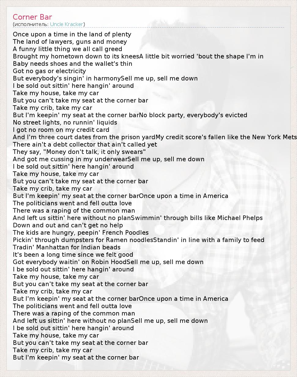 Once upon a time in the land of plenty The land of lawyers, guns and money A funny little thing we all call greed Brought my hometown down to its kneesA little bit worried 'bout the shape I'm in Baby needs shoes and the wallet's thin Got no gas or electricity But everybody's singin' in harmonySell me up, sell me down I be sold out sittin' here hangin' around Take my house, take my car But you can't take my seat at the corner bar Take my crib, take my car But I'm keepin' my seat at the corner barNo block party, everybody's evicted No street lights, no runnin' liquids I got no room on my credit card And I'm three court dates from the prison yardMy credit score's fallen like the New York Mets There ain't a debt collector that ain't called yet They say, "Money don't talk, it only swears" And got me cussing in my underwearSell me up, sell me down I be sold out sittin' here hangin' around Take my house, take my car But you can't take my seat at the corner bar Take my crib, take my car But I'm keepin' my seat at the corner barOnce upon a time in America The politicians went and fell outta love There was a raping of the common man And left us sittin' here without no planSwimmin' through bills like Michael Phelps Down and out and can't get no help The kids are hungry, peepin' French Poodles Pickin' through dumpsters for Ramen noodlesStandin' in line with a family to feed Tradin' Manhattan for Indian beads It's been a long time since we felt good Got everybody waitin' on Robin HoodSell me up, sell me down I be sold out sittin' here hangin' around Take my house, take my car But you can't take my seat at the corner bar Take my crib, take my car But I'm keepin' my seat at the corner barOnce upon a time in America The politicians went and fell outta love There was a raping of the common man And left us sittin' here without no planSell me up, sell me down I be sold out sittin' here hangin' around Take my house, take my car But you can't take my seat at the corner bar Take my crib, take my car But I'm keepin' my seat at the corner bar