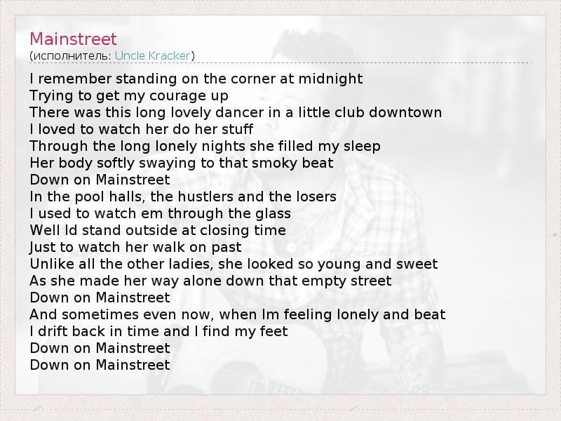 I remember standing on the corner at midnight Trying to get my courage up There was this long lovely dancer in a little club downtown I loved to watch her do her stuff Through the long lonely nights she filled my sleep Her body softly swaying to that smoky beat Down on Mainstreet In the pool halls, the hustlers and the losers I used to watch em through the glass Well Id stand outside at closing time Just to watch her walk on past Unlike all the other ladies, she looked so young and sweet As she made her way alone down that empty street Down on Mainstreet And sometimes even now, when Im feeling lonely and beat I drift back in time and I find my feet Down on Mainstreet Down on Mainstreet