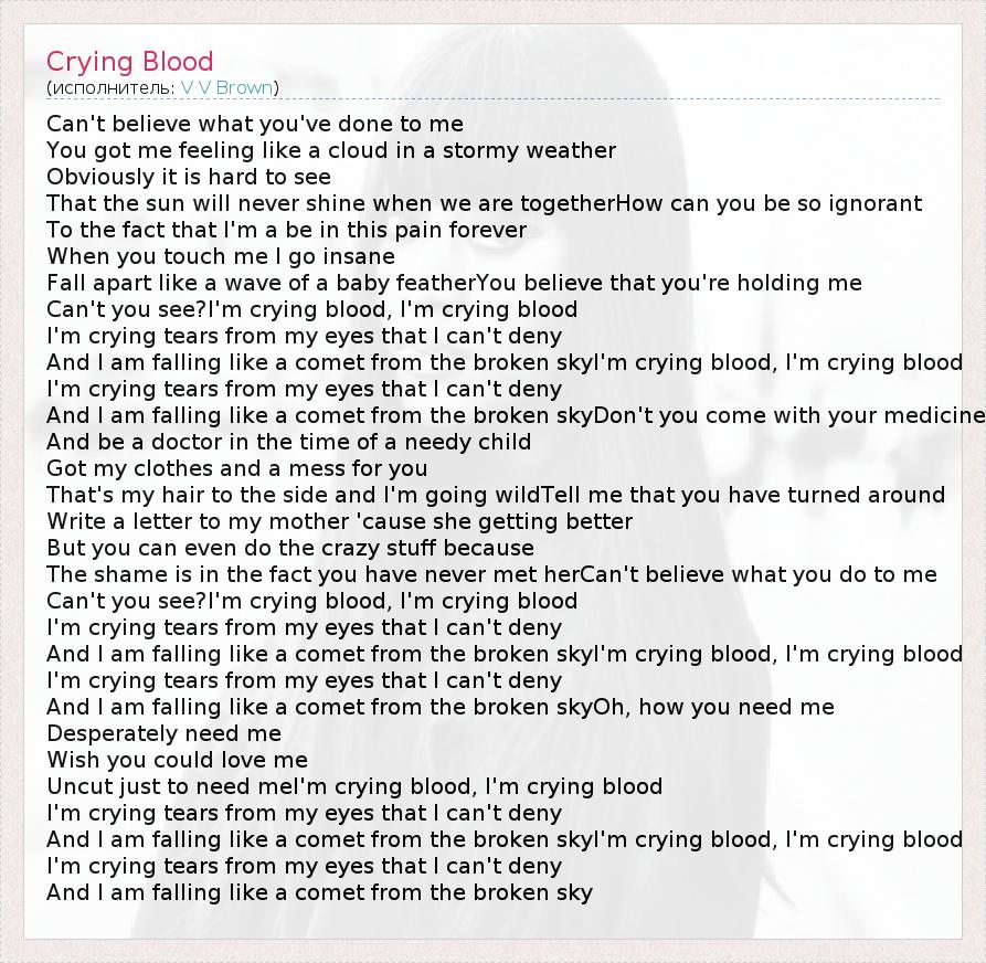 Can't believe what you've done to me You got me feeling like a cloud in a stormy weather Obviously it is hard to see That the sun will never shine when we are togetherHow can you be so ignorant To the fact that I'm a be in this pain forever When you touch me I go insane Fall apart like a wave of a baby featherYou believe that you're holding me Can't you see?I'm crying blood, I'm crying blood I'm crying tears from my eyes that I can't deny And I am falling like a comet from the broken skyI'm crying blood, I'm crying blood I'm crying tears from my eyes that I can't deny And I am falling like a comet from the broken skyDon't you come with your medicine And be a doctor in the time of a needy child Got my clothes and a mess for you That's my hair to the side and I'm going wildTell me that you have turned around Write a letter to my mother 'cause she getting better But you can even do the crazy stuff because The shame is in the fact you have never met herCan't believe what you do to me Can't you see?I'm crying blood, I'm crying blood I'm crying tears from my eyes that I can't deny And I am falling like a comet from the broken skyI'm crying blood, I'm crying blood I'm crying tears from my eyes that I can't deny And I am falling like a comet from the broken skyOh, how you need me Desperately need me Wish you could love me Uncut just to need meI'm crying blood, I'm crying blood I'm crying tears from my eyes that I can't deny And I am falling like a comet from the broken skyI'm crying blood, I'm crying blood I'm crying tears from my eyes that I can't deny And I am falling like a comet from the broken sky