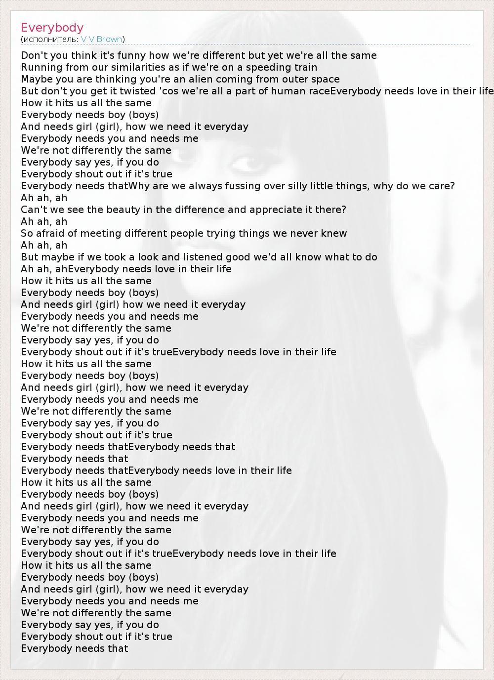 Don't you think it's funny how we're different but yet we're all the same Running from our similarities as if we're on a speeding train Maybe you are thinking you're an alien coming from outer space But don't you get it twisted 'cos we're all a part of human raceEverybody needs love in their life How it hits us all the same Everybody needs boy (boys) And needs girl (girl), how we need it everyday Everybody needs you and needs me We're not differently the same Everybody say yes, if you do Everybody shout out if it's true Everybody needs thatWhy are we always fussing over silly little things, why do we care? Ah ah, ah Can't we see the beauty in the difference and appreciate it there? Ah ah, ah So afraid of meeting different people trying things we never knew Ah ah, ah But maybe if we took a look and listened good we'd all know what to do Ah ah, ahEverybody needs love in their life How it hits us all the same Everybody needs boy (boys) And needs girl (girl) how we need it everyday Everybody needs you and needs me We're not differently the same Everybody say yes, if you do Everybody shout out if it's trueEverybody needs love in their life How it hits us all the same Everybody needs boy (boys) And needs girl (girl), how we need it everyday Everybody needs you and needs me We're not differently the same Everybody say yes, if you do Everybody shout out if it's true Everybody needs thatEverybody needs that Everybody needs that Everybody needs thatEverybody needs love in their life How it hits us all the same Everybody needs boy (boys) And needs girl (girl), how we need it everyday Everybody needs you and needs me We're not differently the same Everybody say yes, if you do Everybody shout out if it's trueEverybody needs love in their life How it hits us all the same Everybody needs boy (boys) And needs girl (girl), how we need it everyday Everybody needs you and needs me We're not differently the same Everybody say yes, if you do Everybody shout out if it's true Everybody needs that
