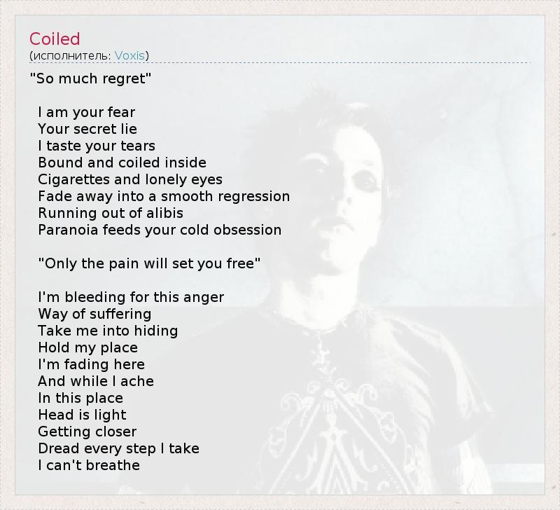 "So much regret" I am your fear Your secret lie I taste your tears Bound and coiled inside Cigarettes and lonely eyes Fade away into a smooth regression Running out of alibis Paranoia feeds your cold obsession "Only the pain will set you free" I'm bleeding for this anger Way of suffering Take me into hiding Hold my place I'm fading here And while I ache In this place Head is light Getting closer Dread every step I take I can't breathe