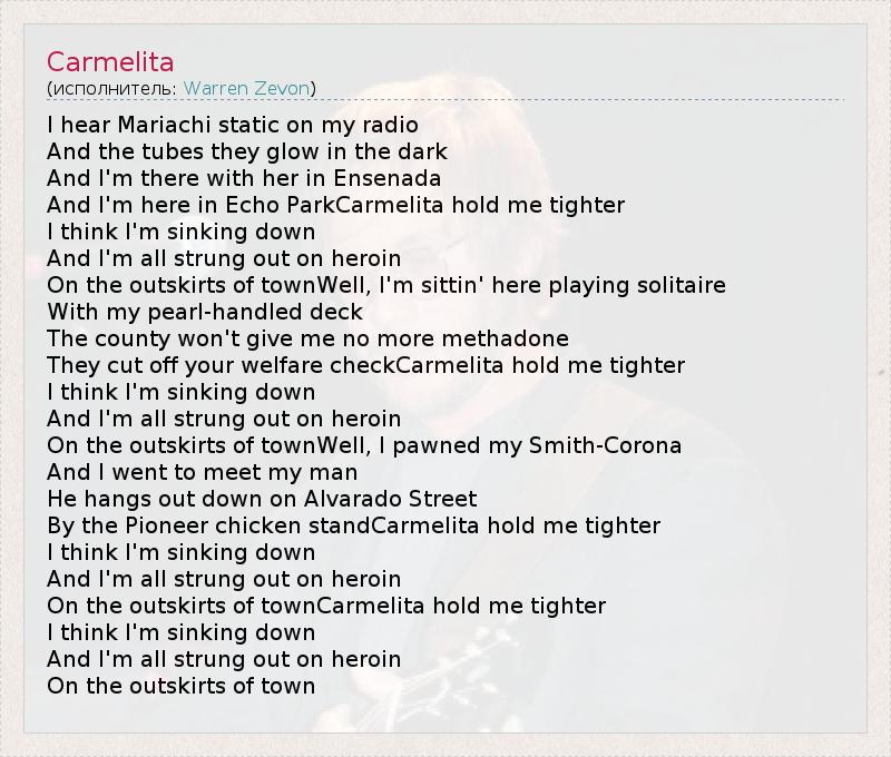 I hear Mariachi static on my radio And the tubes they glow in the dark And I'm there with her in Ensenada And I'm here in Echo ParkCarmelita hold me tighter I think I'm sinking down And I'm all strung out on heroin On the outskirts of townWell, I'm sittin' here playing solitaire With my pearl-handled deck The county won't give me no more methadone They cut off your welfare checkCarmelita hold me tighter I think I'm sinking down And I'm all strung out on heroin On the outskirts of townWell, I pawned my Smith-Corona And I went to meet my man He hangs out down on Alvarado Street By the Pioneer chicken standCarmelita hold me tighter I think I'm sinking down And I'm all strung out on heroin On the outskirts of townCarmelita hold me tighter I think I'm sinking down And I'm all strung out on heroin On the outskirts of town