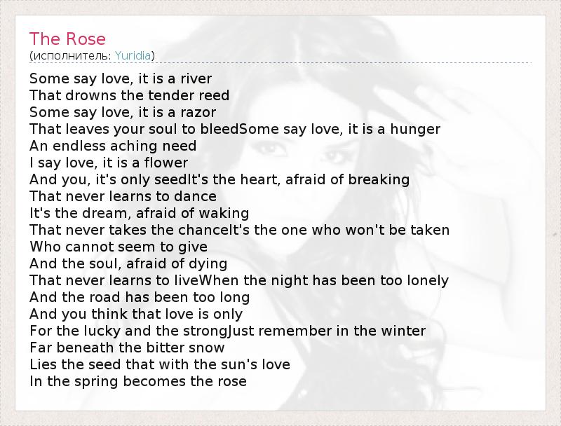 Some say love, it is a river That drowns the tender reed Some say love, it is a razor That leaves your soul to bleedSome say love, it is a hunger An endless aching need I say love, it is a flower And you, it's only seedIt's the heart, afraid of breaking That never learns to dance It's the dream, afraid of waking That never takes the chanceIt's the one who won't be taken Who cannot seem to give And the soul, afraid of dying That never learns to liveWhen the night has been too lonely And the road has been too long And you think that love is only For the lucky and the strongJust remember in the winter Far beneath the bitter snow Lies the seed that with the sun's love In the spring becomes the rose