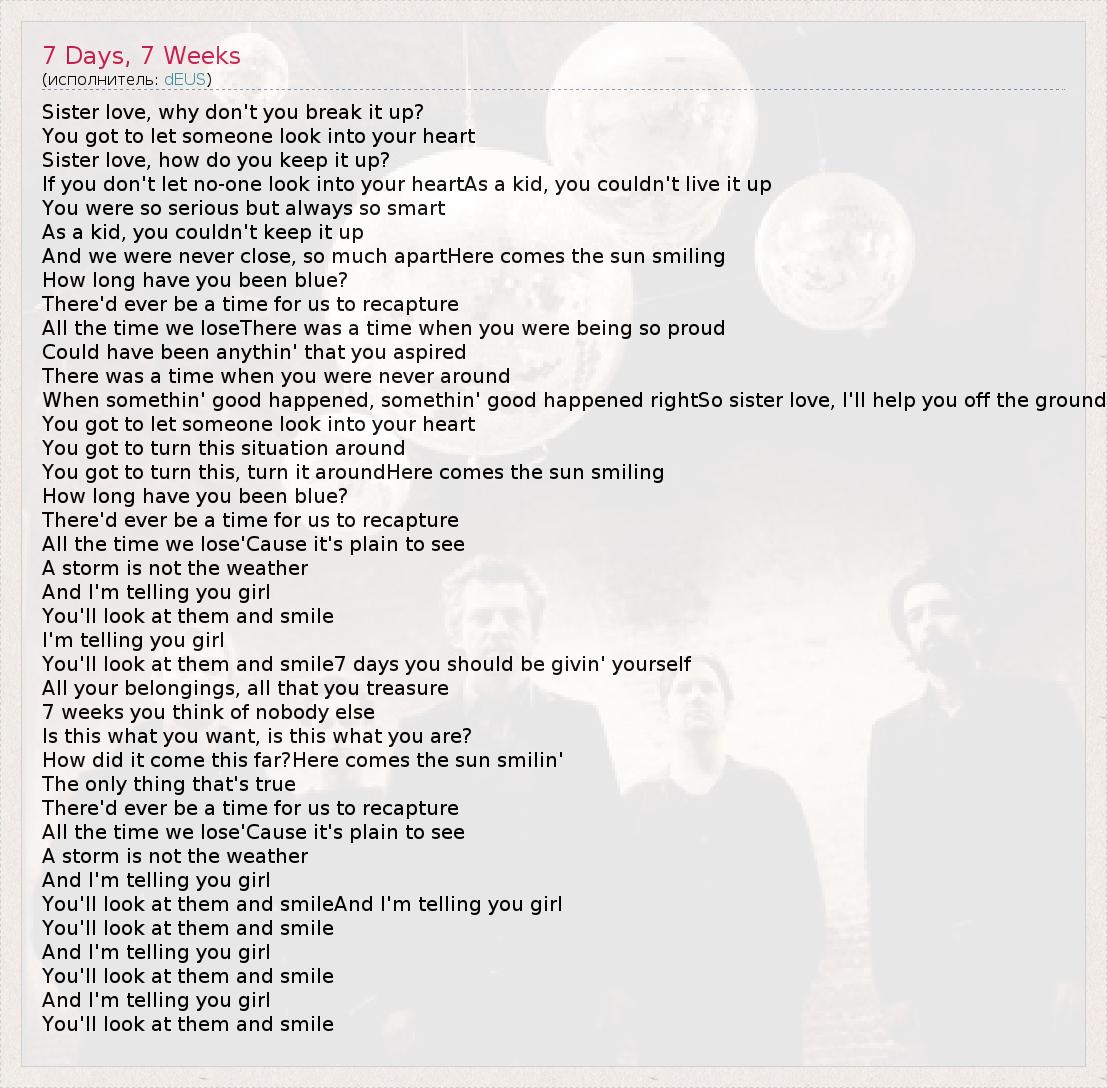 А как ты думаешь, о чем песня "7 Days, 7 Weeks" ?