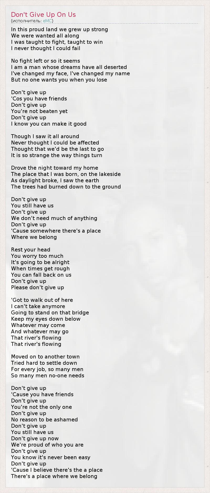 В этой гордой стране мы росли сильными, Мы все время чего-то хотели, Меня научили бороться, научили выигрывать, Я никогда не думал, что проиграю. Битвы окончились или это только кажется? Я человек, чьи мечты опустошены. Я сменил лицо, я сменил имя, Но ты никому не нужен, когда проигрываешь. Не сдавайся, Ведь у тебя есть друзья. Не сдавайся, Тебя еще не сломили. Не сдавайся, Я знаю, у тебя все получится. Хоть я и видел, что происходило вокруг, Я никогда не думал, что и меня это коснется, Я думал, что мы будем последними, кто уйдет, Как странно обернулись вещи. Я ехал всю ночь по направлению к дому, К месту, где я был рожден, у озера, Когда заигрался рассвет, я увидел землю, Все деревья сгорели дотла. Не сдавайся, У тебя все еще есть мы. Не сдавайся, Нам много не нужно. Не сдавайся, Ведь где-то есть место И для нас. Успокой свои мысли, Ты слишком много волнуешься, Все будет в порядке. Когда наступят тяжелые времена, Ты можешь обратиться к нам за помощью. Не сдавайся, Пожалуйста, не сдавайся. Мне придется уехать отсюда, Я не могу это больше выносить. Я собираюсь остаться на этом мосту И закрыть глаза, Что бы ни случилось И чем бы все ни кончилось, Эта река продолжит течь, Эта река продолжит течь. Я переехал в другой город И попытался там обжиться. На каждую работу так много людей, Так много людей никому не надо. Не сдавайся, Ведь у тебя есть друзья. Не сдавайся, Ты не одинок. Не сдавайся, Не стоит стыдиться. Не сдавайся, У тебя все еще есть мы. Не сдавайся, Мы гордимся тем, что ты здесь. Не сдавайся, Ты же знаешь, что все не так просто. Не сдавайся, Ведь я верю, что есть место, Есть место и для нас.