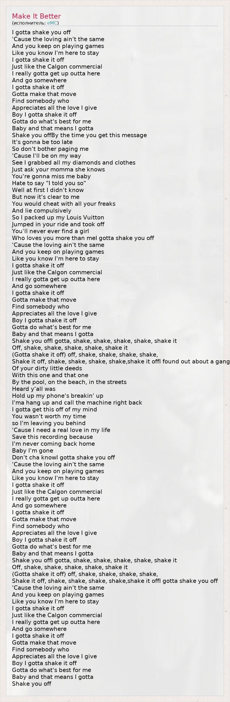 Who loves you more than meI gotta shake you off