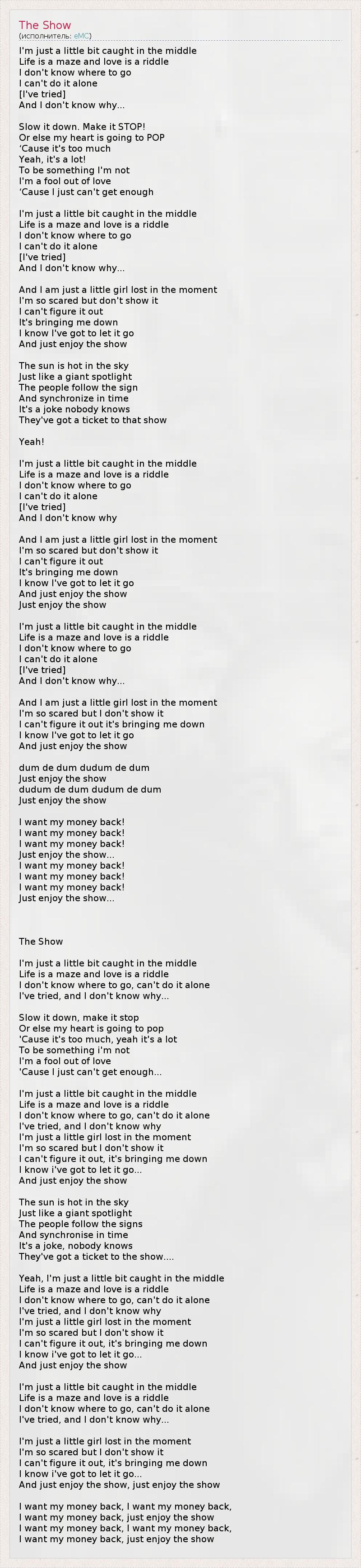 I'm just a little bit caught in the middle Life is a maze and love is a riddle I don't know where to go I can't do it alone [I've tried] And I don't know why... Slow it down. Make it STOP! Or else my heart is going to POP ‘Cause it's too much Yeah, it's a lot! To be something I'm not I'm a fool out of love ‘Cause I just can't get enough I'm just a little bit caught in the middle Life is a maze and love is a riddle I don't know where to go I can't do it alone [I've tried] And I don't know why... And I am just a little girl lost in the moment I'm so scared but don't show it I can't figure it out It's bringing me down I know I've got to let it go And just enjoy the show The sun is hot in the sky Just like a giant spotlight The people follow the sign And synchronize in time It's a joke nobody knows They've got a ticket to that show Yeah! I'm just a little bit caught in the middle Life is a maze and love is a riddle I don't know where to go I can't do it alone [I've tried] And I don't know why And I am just a little girl lost in the moment I'm so scared but don't show it I can't figure it out It's bringing me down I know I've got to let it go And just enjoy the show Just enjoy the show I'm just a little bit caught in the middle Life is a maze and love is a riddle I don't know where to go I can't do it alone [I've tried] And I don't know why... And I am just a little girl lost in the moment I'm so scared but I don't show it I can't figure it out it's bringing me down I know I've got to let it go And just enjoy the show dum de dum dudum de dum Just enjoy the show dudum de dum dudum de dum Just enjoy the show I want my money back! I want my money back! I want my money back! Just enjoy the show... I want my money back! I want my money back! I want my money back! Just enjoy the show... The Show I'm just a little bit caught in the middle Life is a maze and love is a riddle I don't know where to go, can't do it alone I've tried, and I don't know why... Slow it down, make it stop Or else my heart is going to pop 'Cause it's too much, yeah it's a lot To be something i'm not I'm a fool out of love 'Cause I just can't get enough... I'm just a little bit caught in the middle Life is a maze and love is a riddle I don't know where to go, can't do it alone I've tried, and I don't know why I'm just a little girl lost in the moment I'm so scared but I don't show it I can't figure it out, it's bringing me down I know i've got to let it go... And just enjoy the show The sun is hot in the sky Just like a giant spotlight The people follow the signs And synchronise in time It's a joke, nobody knows They've got a ticket to the show.... Yeah, I'm just a little bit caught in the middle Life is a maze and love is a riddle I don't know where to go, can't do it alone I've tried, and I don't know why I'm just a little girl lost in the moment I'm so scared but I don't show it I can't figure it out, it's bringing me down I know i've got to let it go... And just enjoy the show I'm just a little bit caught in the middle Life is a maze and love is a riddle I don't know where to go, can't do it alone I've tried, and I don't know why... I'm just a little girl lost in the moment I'm so scared but I don't show it I can't figure it out, it's bringing me down I know i've got to let it go... And just enjoy the show, just enjoy the show I want my money back, I want my money back, I want my money back, just enjoy the show I want my money back, I want my money back, I want my money back, just enjoy the show