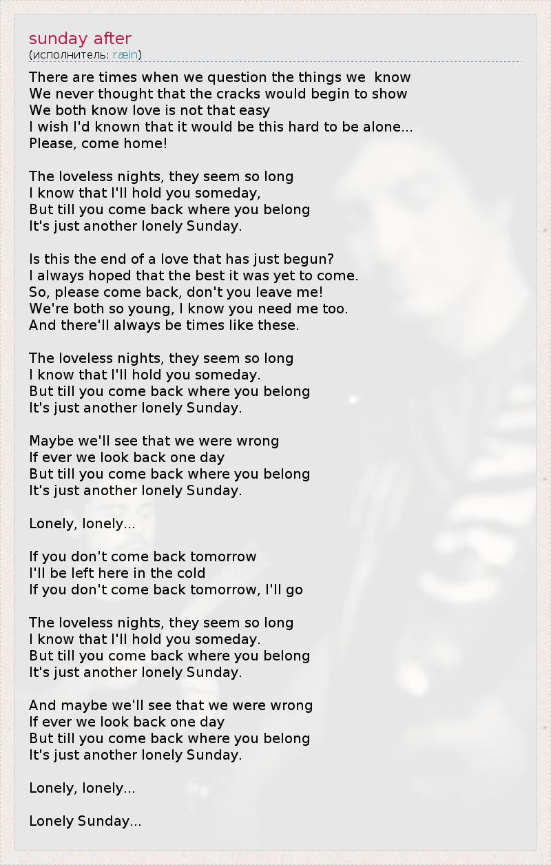 Порой мы сомневаемся даже в том, что знаем наверняка, Мы и не подозревали, что когда-нибудь все может пойти по швам, Нам известно, что любить – не так-то просто, Но жаль, что я не понимал, как трудно быть одному... Прошу, вернись!!! Ночи без любви кажутся невыносимо длинными, Знаю, что обниму тебя однажды, Но пока ты не вернулась туда, где я жду тебя, Это всего лишь еще одно одинокое воскресенье. И неужели любовь кончится вот так, едва начавшись? Я всегда надеялся, что самое лучшее у нас впереди. Так прошу, вернись, только не оставляй меня! Мы так молоды, я знаю, что нужен тебе тоже. А периоды, похожие на этот, будут всегда... Без тебя ночи нестерпимо бесконечны, Конечно, однажды ты будешь моей, Но пока ты не вернулась туда, откуда ушла, Я снова задыхаюсь от одиночества в тоскливое воскресенье. Возможно, мы поймем, что были не правы, Если когда-нибудь оглянемся назад, Но пока ты не поймешь, что ты – часть меня, Я так и буду встречать воскресенье в одиночестве. Одинокое, одинокое... Если ты не вернешься завтра, Холод овладеет моим сердцем, Если ты не вернешься завтра, я уйду... Когда тебя нет, ночи мучительно тянутся веками, Да, когда-нибудь я обниму тебя, Но пока ты не вернулась туда, где ты должна быть, Снова воскресение...и одиночество стучится в мою дверь. И может быть, мы поймем, что были не правы, Если когда-нибудь оглянемся назад, Но пока ты не вернулась, туда где я тебя жду, Я снова впущу к себе воскресное одиночество. Одинокое, одинокое... Одинокое воскресенье...
