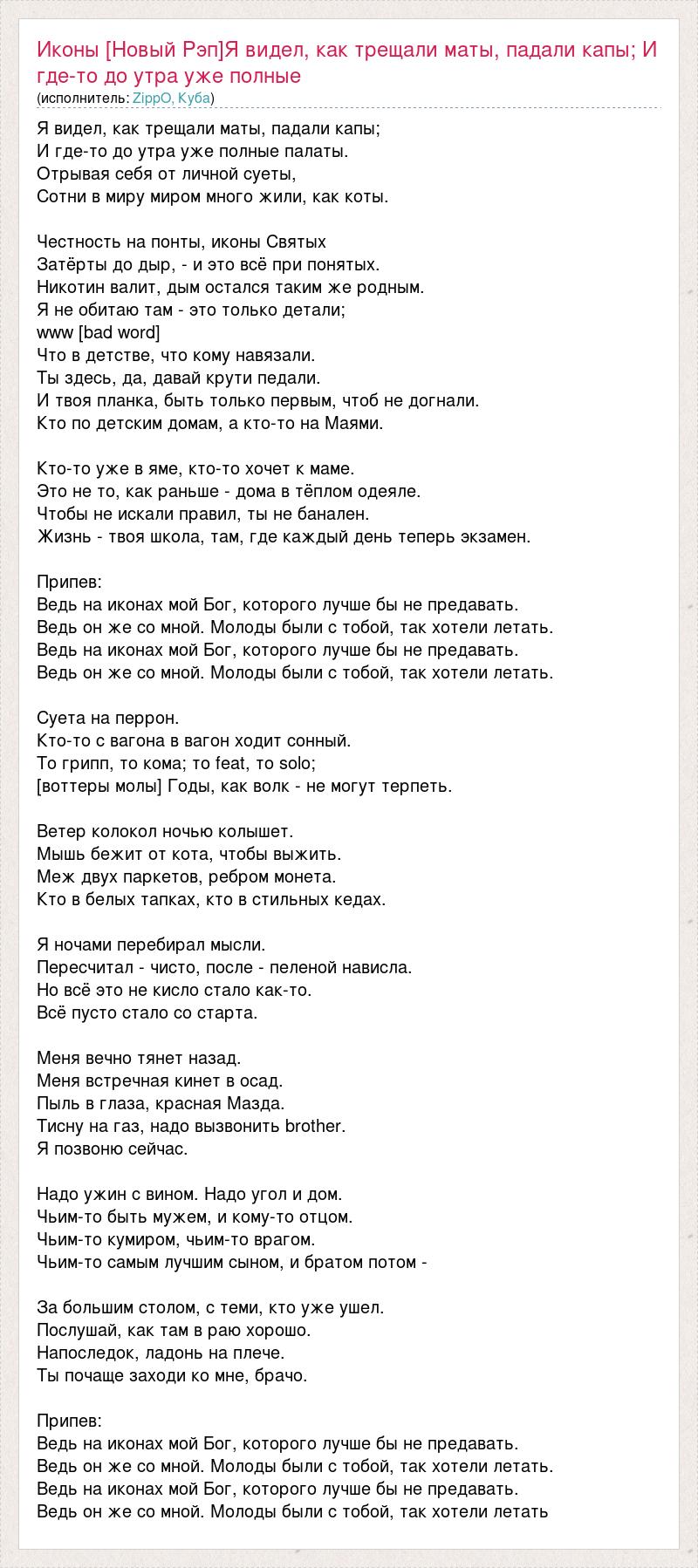 Я видел, как трещали маты, падали капы; И где-то до утра уже полные палаты. Отрывая себя от личной суеты, Сотни в миру миром много жили, как коты. Честность на понты, иконы Святых Затёрты до дыр, - и это всё при понятых. Никотин валит, дым остался таким же родным. Я не обитаю там - это только детали; www [bad word] Что в детстве, что кому навязали. Ты здесь, да, давай крути педали. И твоя планка, быть только первым, чтоб не догнали. Кто по детским домам, а кто-то на Маями. Кто-то уже в яме, кто-то хочет к маме. Это не то, как раньше - дома в тёплом одеяле. Чтобы не искали правил, ты не банален. Жизнь - твоя школа, там, где каждый день теперь экзамен. Припев: Ведь на иконах мой Бог, которого лучше бы не предавать. Ведь он же со мной. Молоды были с тобой, так хотели летать. Ведь на иконах мой Бог, которого лучше бы не предавать. Ведь он же со мной. Молоды были с тобой, так хотели летать. Суета на перрон. Кто-то с вагона в вагон ходит сонный. То грипп, то кома; то feat, то solo; [воттеры молы] Годы, как волк - не могут терпеть. Ветер колокол ночью колышет. Мышь бежит от кота, чтобы выжить. Меж двух паркетов, ребром монета. Кто в белых тапках, кто в стильных кедах. Я ночами перебирал мысли. Пересчитал - чисто, после - пеленой нависла. Но всё это не кисло стало как-то. Всё пусто стало со старта. Меня вечно тянет назад. Меня встречная кинет в осад. Пыль в глаза, красная Мазда. Тисну на газ, надо вызвонить brother. Я позвоню сейчас. Надо ужин с вином. Надо угол и дом. Чьим-то быть мужем, и кому-то отцом. Чьим-то кумиром, чьим-то врагом. Чьим-то самым лучшим сыном, и братом потом - За большим столом, с теми, кто уже ушел. Послушай, как там в раю хорошо. Напоследок, ладонь на плече. Ты почаще заходи ко мне, брачо. Припев: Ведь на иконах мой Бог, которого лучше бы не предавать. Ведь он же со мной. Молоды были с тобой, так хотели летать. Ведь на иконах мой Бог, которого лучше бы не предавать. Ведь он же со мной. Молоды были с тобой, так хотели летать