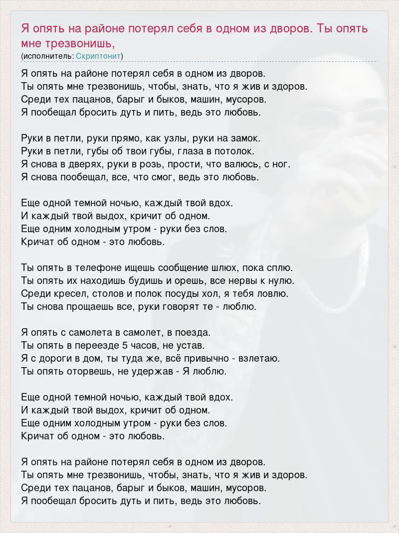 Главная→Исполнители→Скриптонит→Я опять на районе потерял себя в одном из дворов. Ты опять мне трезвонишь,